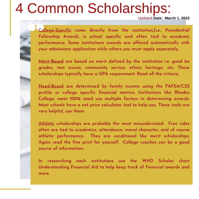 Securing scholarships is a crucial element in college access and success. College costs should never prohibit anyone from access to a college education. Applying for scholarships is the best second job. Whether you are a freshman in high school or a senior in college, you should always be applying for scholarships.